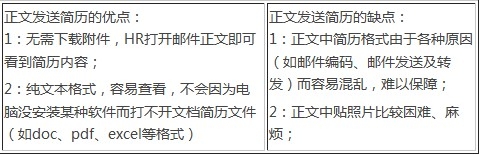 (1)Email投递简历究竟是用正文发送简历还是附件发送简历? 这个问题一直都是Email投递简历争论的交点,各有各的理。就这个问题而已,建议大家视具体情况,灵活处理。在此之前,大家应了解正文发送简历和附件发送简历各自适用的背景和优缺点。 正文发送简历: 很多公司的Email邮箱容量比较小,且为了防止电脑病毒传播,很多公司的邮件系统是不允许邮件中带附件的。如果是这种情况,带附件的邮件要么是被直接删 除,要么就是附件被删除。正是基于这个原因,很多公司的HR在接收简历的时候,要么选择163、Gmail、Sohu、Yahoo等公共邮箱,要么使用不 能接收附件的公司邮箱。如果是不能接收附件的公司邮箱,就需要应聘者将简历以Email正文的形式发送。